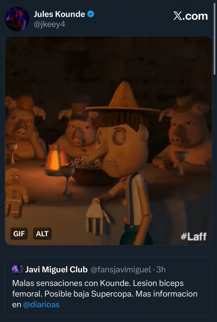 记者称孔德可能因伤无缘西超杯,球员社媒转发并晒匹诺曹辟谣 【发布时间】:2025-12-23 08:30 【来源】:24直播网 12月22日讯 西甲第17轮比赛,巴萨客场2-0击败比利亚雷亚尔,巴萨边卫孔德比赛中受伤离场。记者Javi Miguel社媒表示,孔德的伤情令人担忧,初步诊断为股二头肌受伤,可能缺席西班牙超级杯。孔德社媒转发了这条消息,并配上“匹诺曹”的动图进行辟谣。