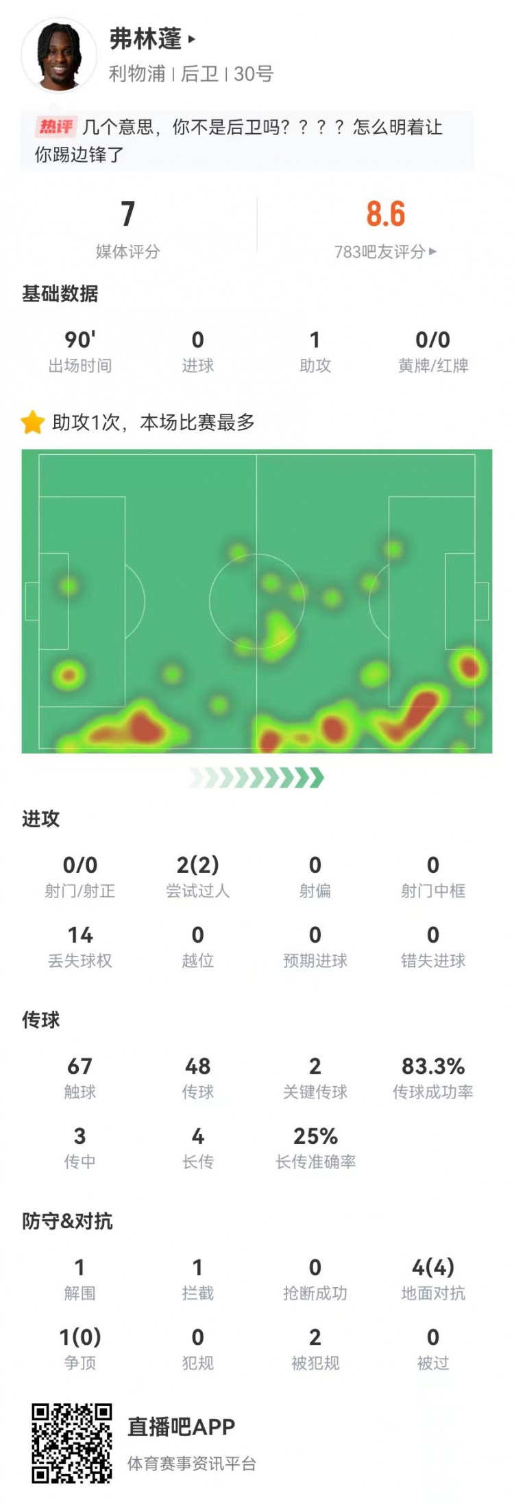 弗林蓬本场1助攻+2关键传球 2过人2成功 2造犯规+5对抗4成功 【发布时间】:2025-12-28 08:30 【来源】:24直播网 12月28日讯 利物浦在本轮英超对阵狼队,弗林蓬本场数据如下:首发踢满全场1助攻2过人、2成功14丢失球权67触球48传球,成功率83.3%2关键传球3传中4长传、1成功1解围1拦截5对抗、4成功2造犯规获评7分