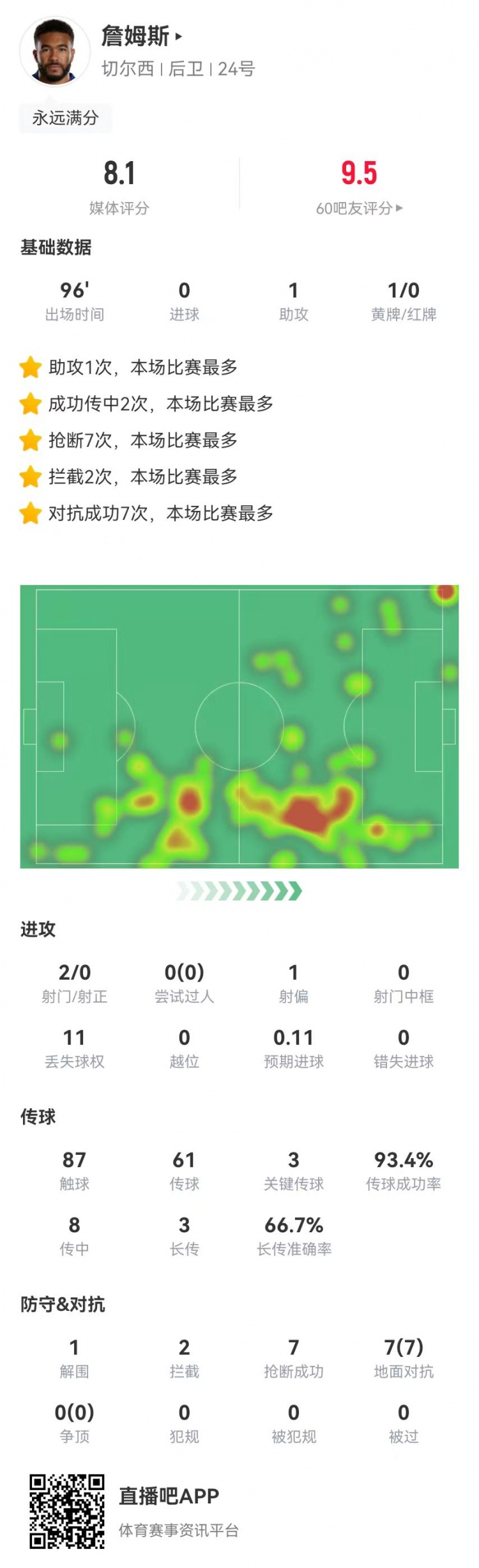 詹姆斯本场2射0正+1助攻 3关键传球+8传中 7抢断+7对抗7成功 【发布时间】:2025-12-29 08:30 【来源】:24直播网 12月28日讯 切尔西在本轮英超对阵维拉,詹姆斯本场数据如下:首发踢满全场1助攻2射0正预期进球0.1111丢失球权87触球61传球,成功率93.4%3关键传球8传中3长传、2成功1解围2拦截7抢断7对抗、7成功获评8.1分