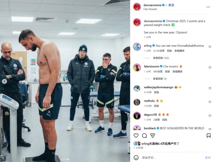 多纳鲁马晒赤裸上身称体重照,哈兰德:现在可以开吃啦,烤肉鲁马 【发布时间】:2025-12-29 08:30 【来源】:24直播网 12月28日讯 英超第18轮曼城2-1战胜森林,赛后多纳鲁马社媒晒出队内体重检测照片,并庆祝胜利。多纳鲁马:“2025年圣诞节:3分到手,体重检测也通过啦 ✅“新年再见,城民们!”哈兰德评论:“多纳烤肉鲁马,你现在可以开吃啦!”